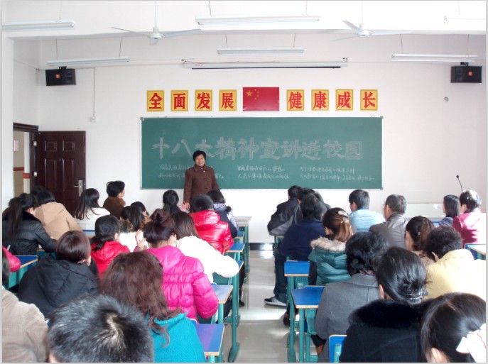 宣講會過程中,李金玉圍繞黨的十八大報告精神,結合學校的工作實際,提出了今后學校發展的一系列計劃和措施:大力推進依法治校,進一步落實立德樹人的根本任務;加強和改進中小學德育工作,繼續組織開展中小學弘揚和培育民族精神教育活動;深入實施素質教育,推動學校中華經典誦讀、體育、藝術、衛生與健康教育工作穩步發展;加強教師隊伍建設,提升教師專業化水平,抓好“青藍工程隊伍”建設,進一步提高教育質量;維護學校安全與穩定,加強學生安全教育,做好校園安全防范工作,做好學校傳染病防控工作,建設安全校園。李金玉要求,從現在開始,全校教師要切實增強貫徹落實十八大精神的自覺性和堅定性;要立足教育教學崗位實際,解放思想,實事求是,與時俱進,開創進取;要切實履行好工作職責,站在民族復興的歷史新方位,迎接前所未有的復興曙光。教育工作者必須牢記使命,不忘責任,敢于擔當,為了培養建設祖國、保衛祖國的棟梁之才,為早日實現中華民族偉大復興貢獻力量。